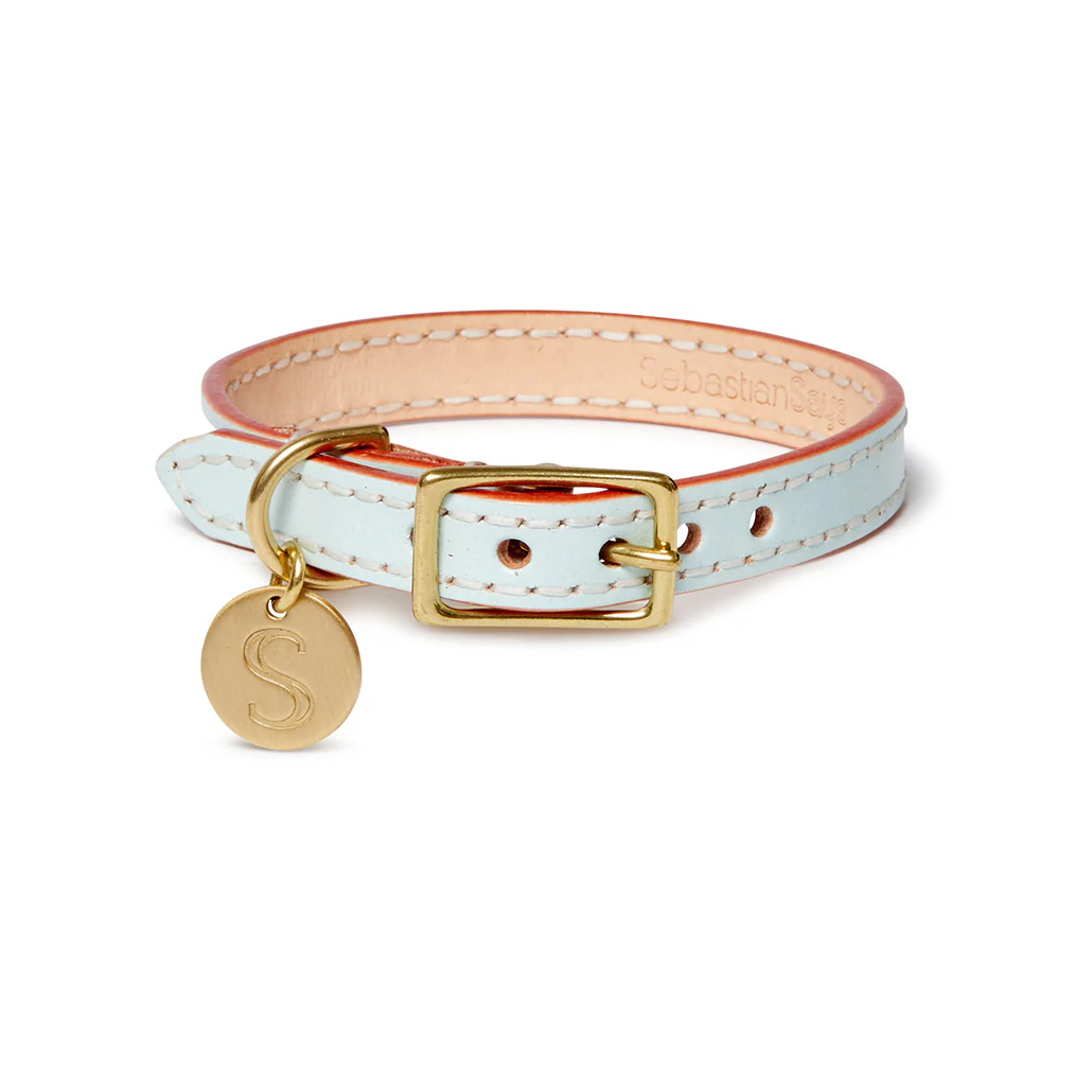 The Sebastian Says Italian Leather Dog Collar, is hand crafted with strong durable stitching. Free from azo compounds we use soluble vegetable dyes. Featuring the signature SS charm with solid gold brass. Nothing ages more beautifully than these materials combined. Pick ice blue for a soft pastel touch and add monogramming to personalize your dogs unique collar to be treasured a lifetime.